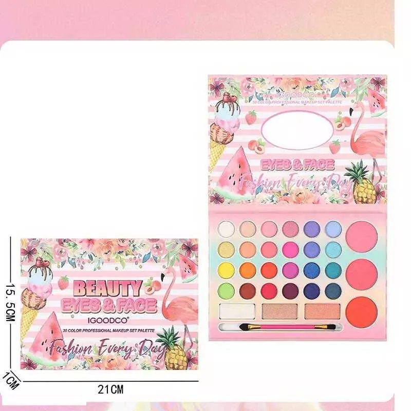Набір включає яскраві кольори у палетці з милим дизайном, пензлик та дзеркальце.