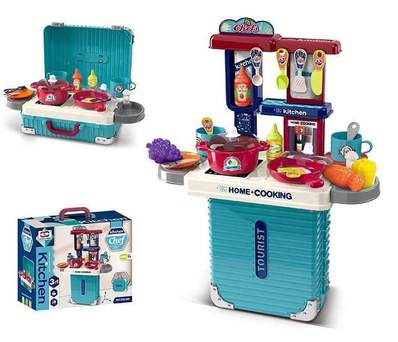 - набір 3 в 1: трансформація з кухні (розкладений/напіврозкладений вигляд) у валізу;