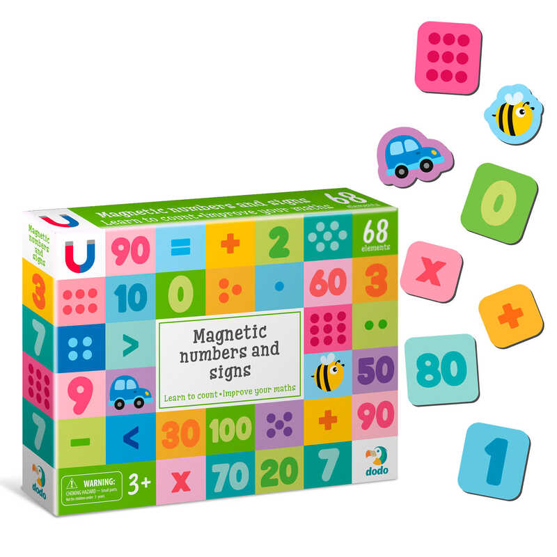 Набір магнітів Dodo "Магнітні цифри і знаки" — це чудовий спосіб навчити дитину основам математики через гру! У наборі 68 яскравих елементів, серед яких цифри, математичні знаки (додавання, віднімання, множення та інші), а також милі фігурки бджілок та машинок для рахування.