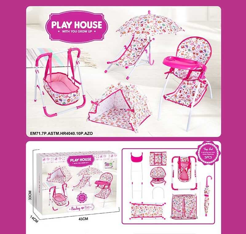 - розміри: люлька-гойдалка: 31х33х41 см; лежак: 42,7х20,5х20 см; парасолька: 53х43 см; стільчик для годування: 42х23,5х50 см; намет-будиночок: 40 × 40 × 30 см;