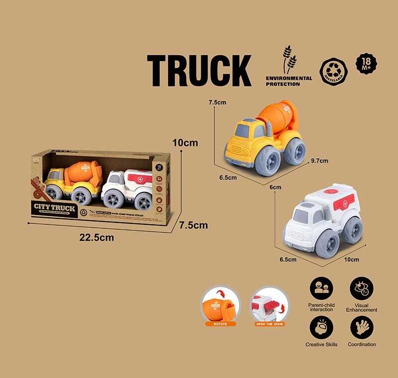 - 2 машинки у вигляді спецтехніки: швидка допомога, бетонозмішувач;