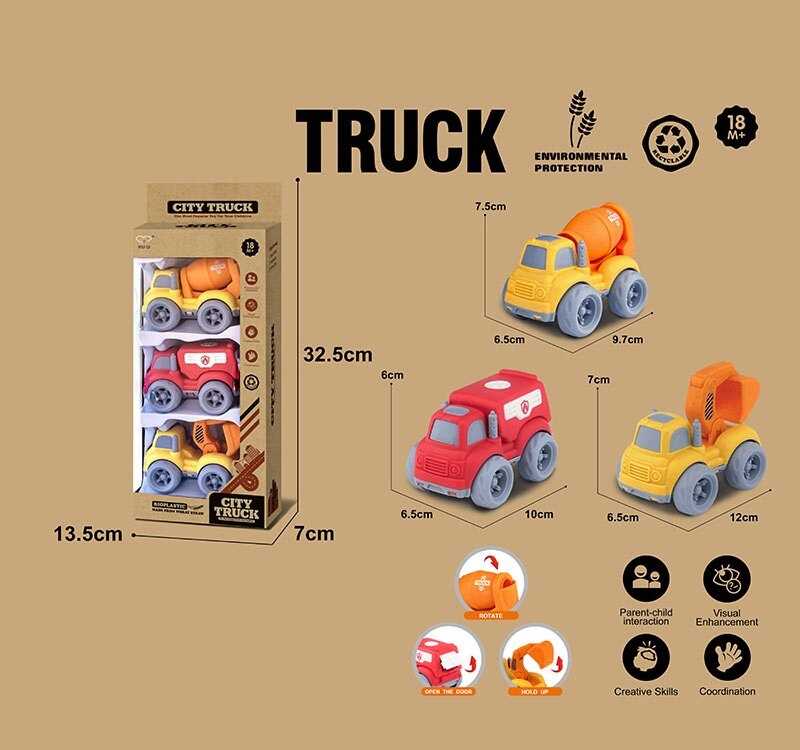 - 3 машинки у вигляді спецтехніки: пожежна машина, бетонозмішувач, екскаватор;