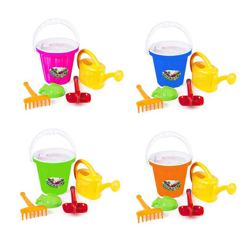 У комплект для гри в піску входить відерце, лопатка і граблі, пасочка, лійка, а також сито, яке виконує роль кришки. Такий чудовий дитячий набір для пісочниці допоможе дитині урізноманітнити своє дозвілля, розвинути свою фантазію і колірне сприйняття, тактильні відчуття і пізнавальний навик.