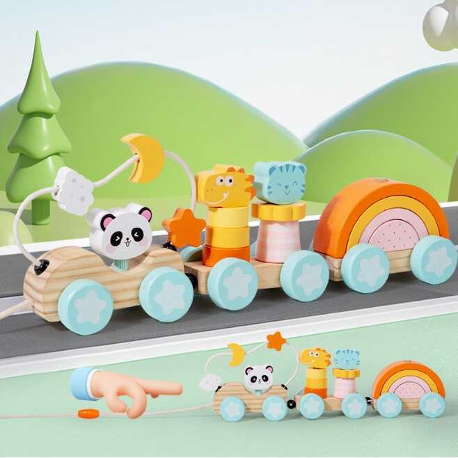 Дерев’яний потяг-сортер — це яскрава розвивальна іграшка. Малюк може нанизувати фігурки на кілочки, пересувати потяг за мотузочку чи грати з окремими вагонами.