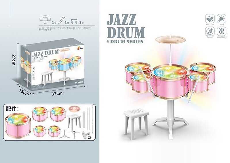 Ця яскрава барабанна установка стане чудовим стартом для маленького музиканта. Комплект складається з п’яти барабанів, кожен із яких має підсвічування, що реагує на удари, роблячи гру ще динамічнішою та захопливішою. Разом з установкою дитина отримує барабанні палички та зручний стільчик, тож можна одразу розпочинати перший імпровізований концерт. Така іграшка розвиває ритм, координацію та творчість у грі.