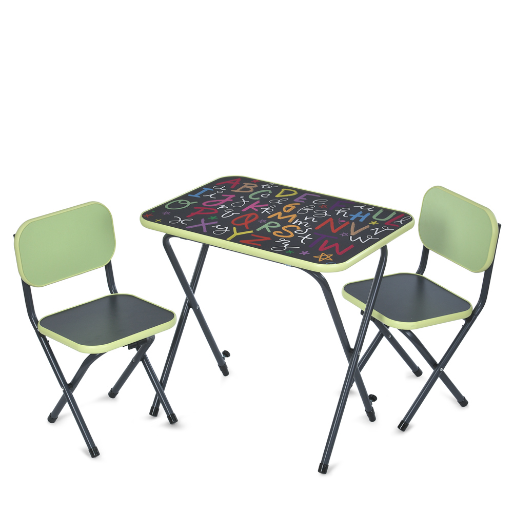 Дитячий стіл Alphabet салатовий з двома стільцями - має гладку стільницю, яка легко очищається від забруднень, на її поверхні намальовані літери англійського алфавіту, що додає елемент навчання та надихає дитину на вивчення нових знань.