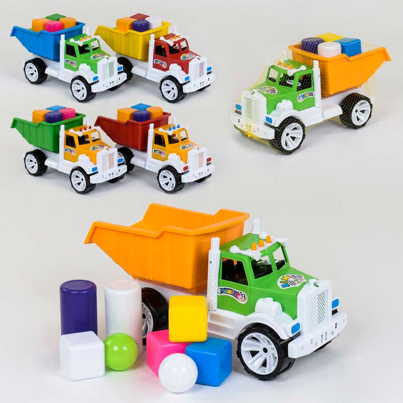 Яскравий самоскид з відкидним ковшем наповнений різними пластиковими фігурами (кульками, циліндрами і кубиками) прекрасно підійде для будівництва та перевезення будівельних матеріалів або улюблених іграшок. Чудова іграшка для сюжетно-рольових ігор, в процесі гри дитина зможе познайомитися з реальною технікою - потужними професійними автомобілями, дізнається особливості їх будови і способи використання!