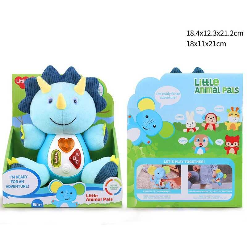 - на животику іграшки розташовані 3 функціональні кнопки: кумедні звуки та слова англійською мовою, а також веселі мелодії;