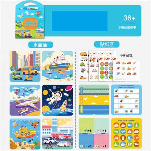 Магічна водна книга з наліпками — це неймовірно цікава й безпечна розвага для малюків! Варто лише наповнити ручку водою й провести по сторінці — і з’являться яскраві сюжети. Коли сторінки висихають, малюнки зникають, і дитина може розмальовувати знову й знову.