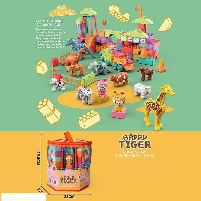 В набор входит 45 деталей из которых юный архитектор сможет выстроить настоящий парк развлечений с мини-зоопарком, где будут проводить весело время 3 кукольных малыша в костюмчиках зверюшек. Игровые модельки оснащены специальной блочной подставкой, которая подходит ко всем элементам конструкции.