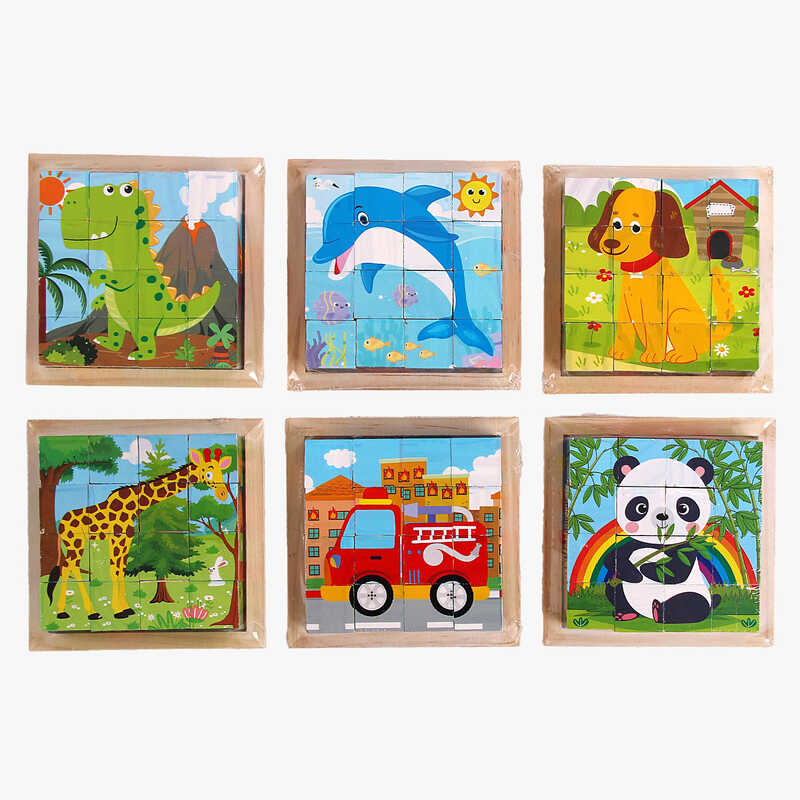 Збираючи яскраве зображення з дерев'яних кубиків, дитина розвивається, вчиться мислити логічно, тренує дрібну моторику та координацію рухів. Дерев'яні кубики-пазл - це 6 маленьких казкових подорожей у світ природи, тварин або транспорту. Вони складуть чудову компанію малечі вдома, у гостях або у довгих подорожах. Ігровий комплект має компактний розмір і виготовлений з екологічно чистих і безпечних для дитячого здоров’я матеріалів, що є важливими критеріями у виборі розвивальних іграшок для найменших.