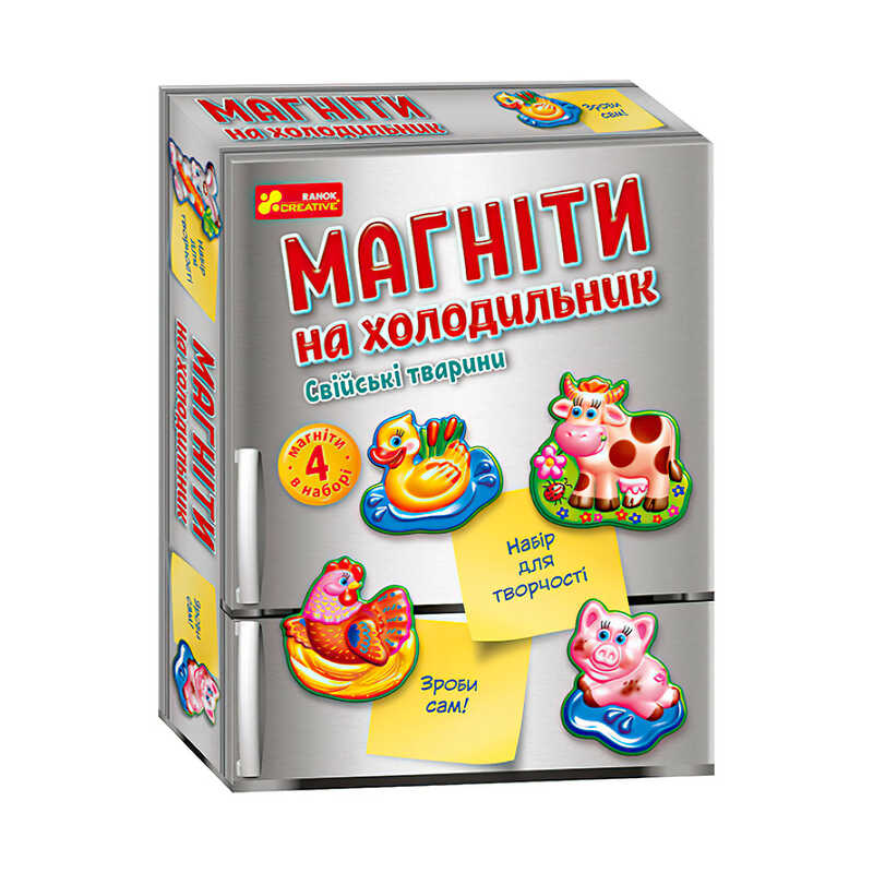 За допомогою нашого набору робимо 4 яскравих та барвистих магніти на холодильник: тигра, слона, бегемотика, панду.