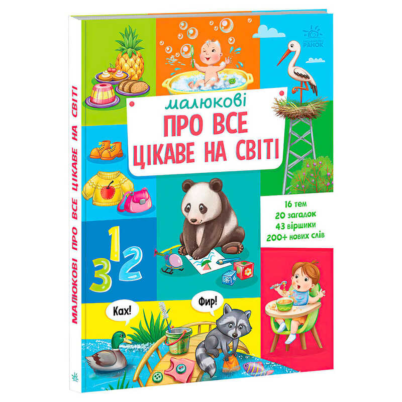 У цій енциклопедії малюк знайде великі яскраві ілюстрації, цікаві віршики та загадки, які дозволять йому з легкістю опанувати майже 300 нових слів з таких тем: абетка, фігури, кольори, цифри, мешканці лісу, мешканці річки, моря, лугу, подвір’я, зоопарку, техніка, оселя, меблі, побутові прилади, столові та кухонні предмети, гігієнічні засоби.
