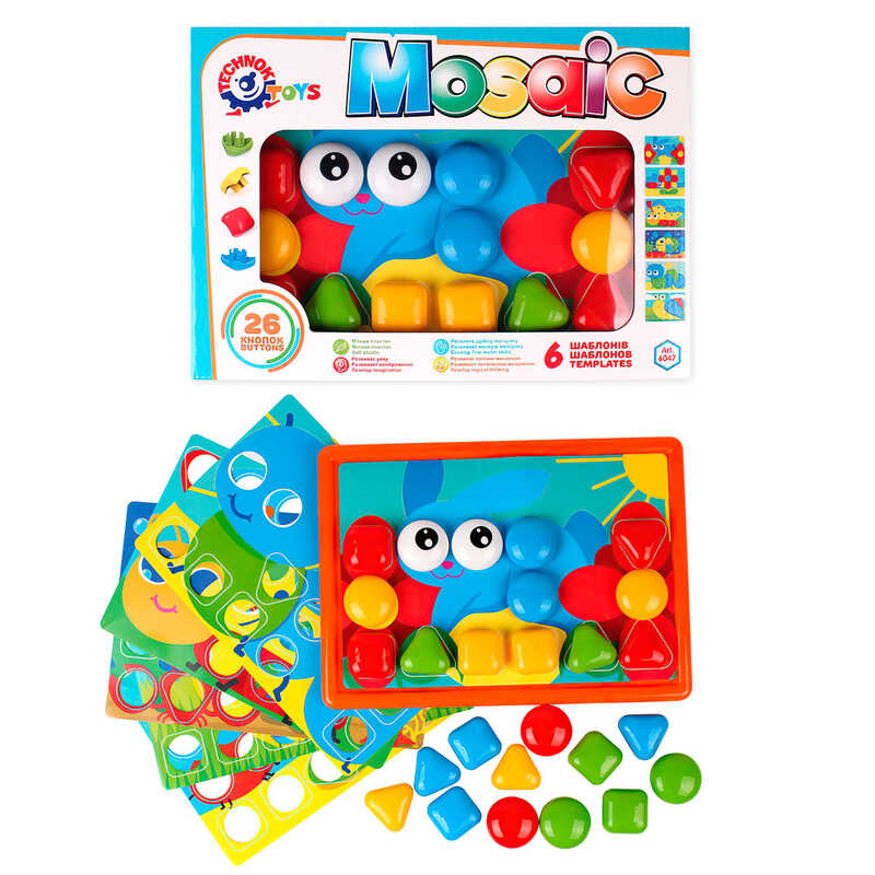 «Мозаїка ТехноК» - стане незамінною іграшкою в арсеналі усіх, хто любить і відповідальних батьків, адже поєднує в собі дуже багато важливих речей. Діти полюблять цю іграшку за розмаїття барв, за можливість фантазувати та розвивати уяву, за велику кількість ігрових елементів, які так цікаво збирати разом. Дорослі відзначать навчально - розвиваючий ефект мозаїки. Так, ця, на перший погляд, проста іграшка, виховує у дитини уважність і посидючість, тренує пам'ять і розвиває дрібну моторику. З мозаїкою можна вивчати кольори та форми, виконувати різні завдання по сортуванню.
