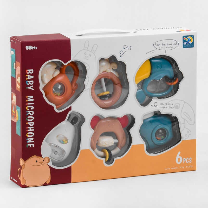 У комплектацію входить 6 брязкалець, які поєднують в собі розвивальний функціонал, оригінальний дизайн і пофарбовані в приємні пастельні відтінки.