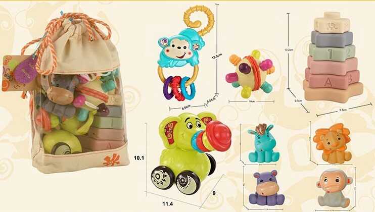 Набір брязкалець 9996 G - це багатогранний мікс найцікавіших та найрізноманітніших іграшок для маленьких карапузів! В милому мішечку можна знати як і більш класичні, так і розвивальні, функціональні моделі. Цікаві форми та приємні текстури будуть стимулювати розвиток дрібної моторики, сенсорно-зоворого сприйняття та логічного мислення. Кожне брязкальце виконано з якісних матеріалів, які повністю безпечні для здоров’я малюка.