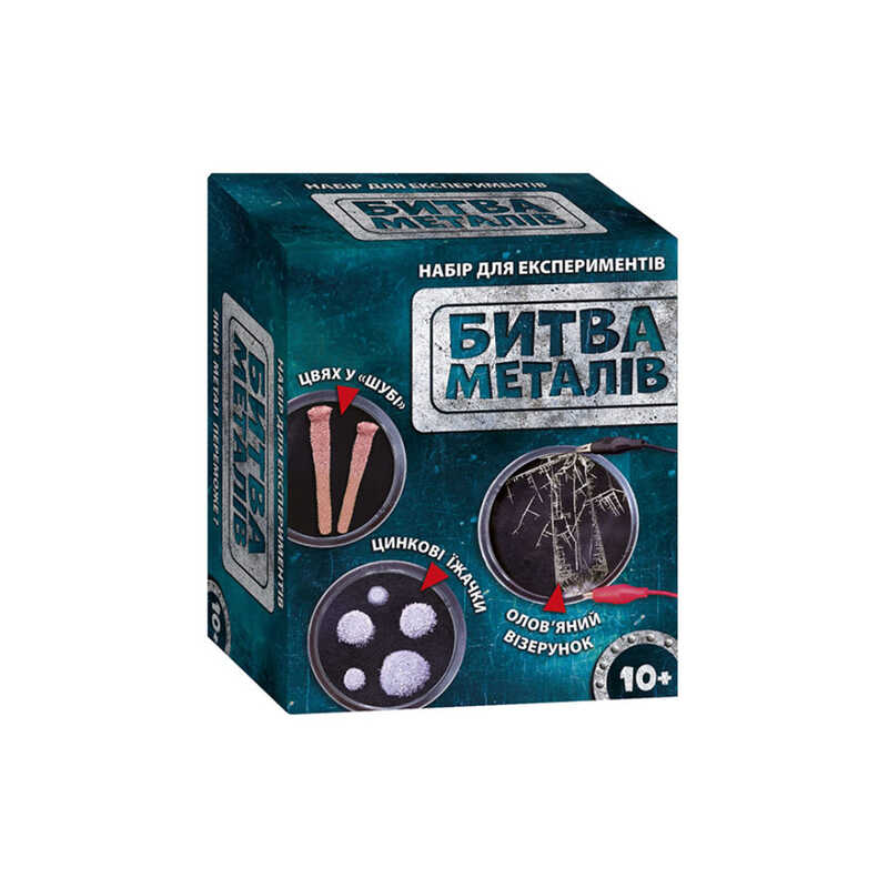 Завдяки цьому набору ви дізнаєтеся, як проводяться різні метали під дією електричного струму й хімічних реакцій, побачите протистояння міді й заліза на право перебувати в розчині солі, навчитеся добувати олово з розчину за допомогою електрики, а також станете свідком реакції заміщення олова цинком.
