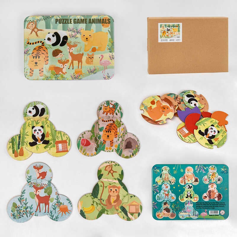 У комплектацію входить 8 пар логічних пазлів, на кожному з яких зображено веселе звірятко та характерне для нього місце існування.