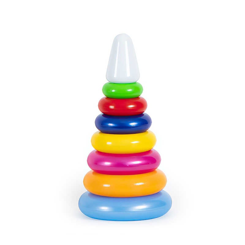 Дитяча пірамідка – яскрава та позитивна іграшка для допитливих діток, яких хочуть пізнавати світ навколо. Суть гри з цим предметом полягає в тому, що малюк повинен надіти на основу диски з отворами посередині. До верху діаметр елементів звужується і конструкція закінчується деталлю у вигляді конуса. Подібна будова змусить малюка бути уважним і стежити за розмірами елементів піраміди. В іграшці поєднуються різні кольори, що робить її дуже барвистою та привабливою для дитини. Гра допоможе маленькому будівельнику розвинути дрібну моторику рук, логічне та образне мислення. Виготовлена із пластику.