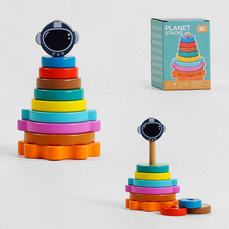 Кожен елемент цієї пірамідки представляє одну з наших фантастичних планет – Меркурій, Венеру, Землю, Марс, Юпітер, Сатурн, Уран та Нептун. Захоплюючись їхньою красою та величчю, малюк зможе дізнатися унікальні особливості кожної планети та їхню вражаючу різноманітність.