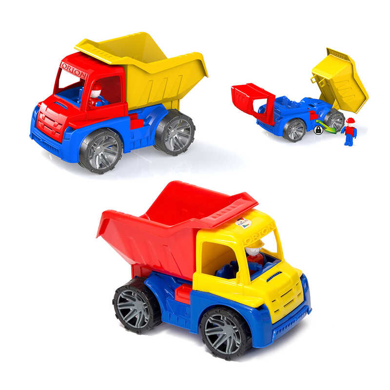 Іграшковий самоскид обладнаний відкидним кузовом, що буде дуже до речі для перевезення сипучих матеріалів.