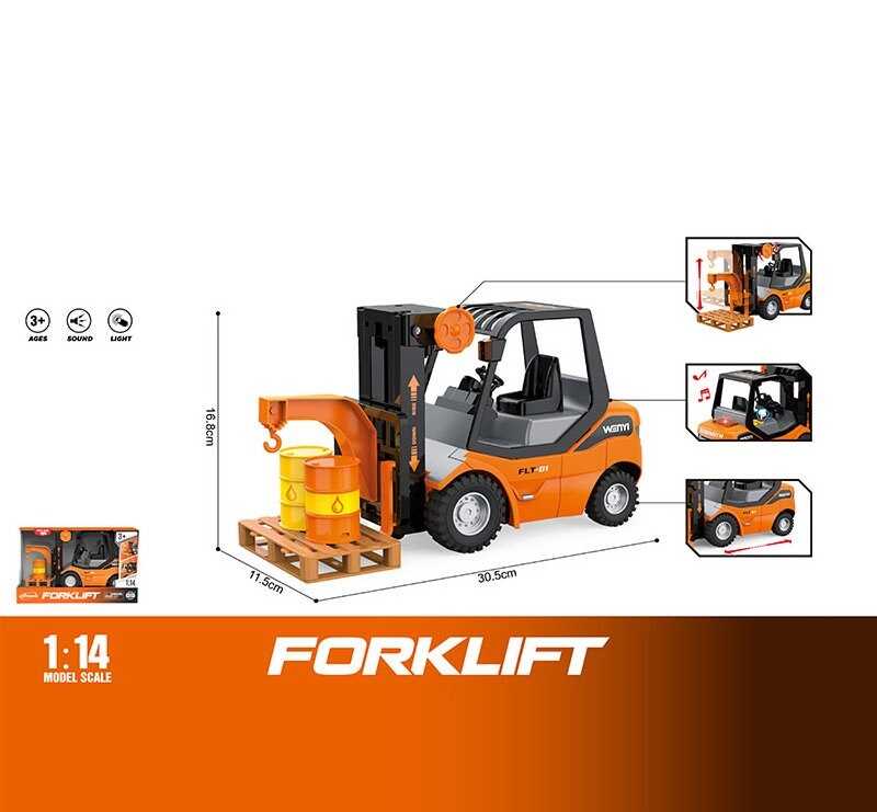 Іграшковий навантажувач Forklift — реалістична модель спецтехніки, створена для захопливих ігор. Машинка обладнана підйомним механізмом з краном і піддоном з ящиками, що додає грі правдоподібності. Спецтехніка має світлові та звукові ефекти, які імітують роботу справжнього навантажувача. Іграшка допомагає розвивати координацію, уяву та інтерес до техніки.