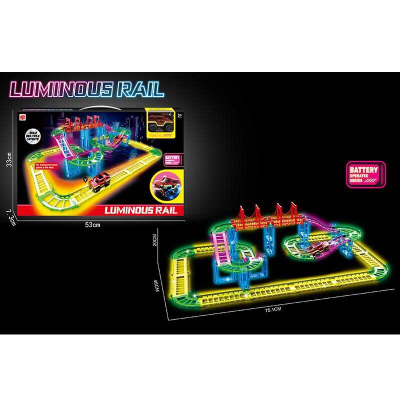 Вирушай у незабутню подорож із крутим іграшковим треком! Його люмінесцентні шляхи світяться в темряві, створюючи захопливу атмосферу перегонів. У комплекті є машинка на батарейці, яка мчить трасою, долаючи круті повороти та спуски. Легко з'єднуй деталі треку, створюючи власні унікальні маршрути. Цей трек стане справжнім хітом для юних гонщиків і подарує безліч годин захопливої гри!