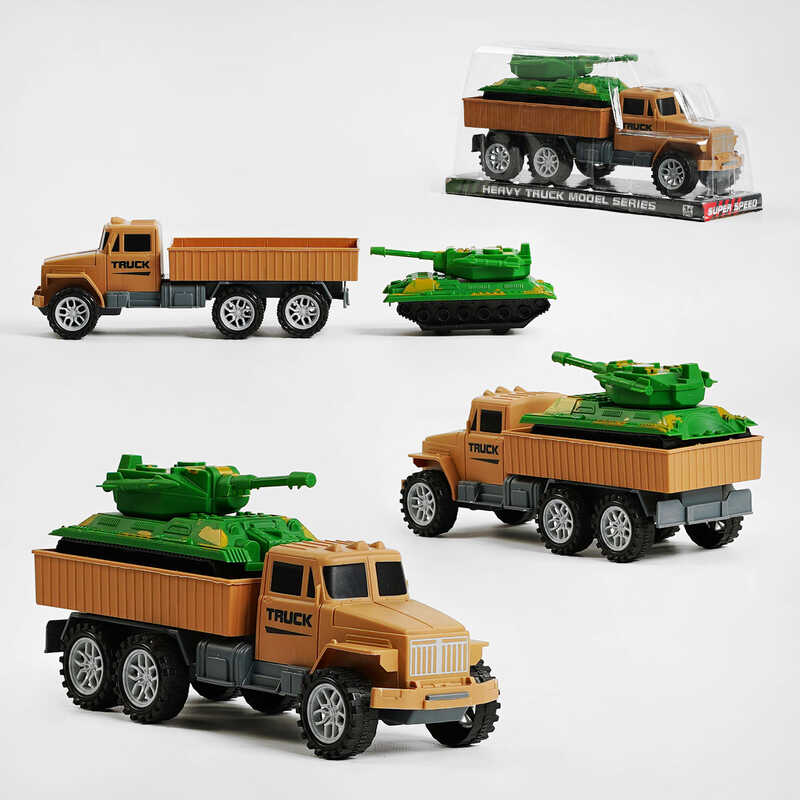 Сучасний трейлер для хлопчика, який захоплюється машинками військової тематики. Оригінальна модель з відповідним військовим забарвленням та написами. Трейлер перевозить танк, який вже зачекались герої. Машина обладнана інерційним механізмом, який дає їм можливість набрати велику швидкість та самостійно рухатись у заданому напрямку.