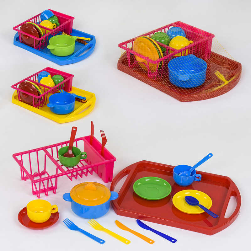 У комплект крім іграшкового посуду є також симпатична сушка, на якій можна зберігати її після миття. Такі сюжетні ігри допоможуть стати дівчинці більш самостійною, а ще розвинуть фантазію та образне мислення. Набір виготовлений з якісного пластику. Комплектація 1 рознос, 3 тарілки, 3 чашки, 3 ложки, 3 вилки, 3 ножі, 1 каструля, 1 кришка, 1 сушка. Набір виконаний з пластмаси.